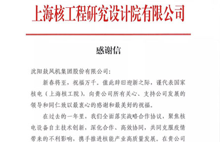 上海核工院向沈鼓集團發(fā)來感謝信!