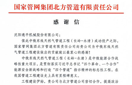 12月10日,在中俄東線天然氣管道工程(長嶺-永清)成功投產(chǎn)之際,國家管網(wǎng)集團(tuán)北方管道有限責(zé)任公司給沈鼓集團(tuán)發(fā)來感謝信,對沈鼓集團(tuán)克服疫情影響,積極復(fù)工復(fù)產(chǎn),保證工期進(jìn)度予以高度贊揚,對沈鼓集團(tuán)為中俄東線天然氣管道項目提供的壓縮機產(chǎn)品和服務(wù)質(zhì)量予以肯定。